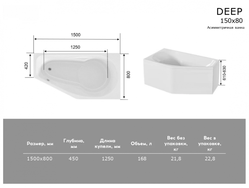 Акриловая ванна "DEEP" 150х80 L по низкой цене в наличии в интернет-магазине сантехники «Водолей» в Муслюмово. Мы предлагаем самую низкую цену на ванны акриловые производителя 1Marka. Приобрести Акриловая ванна "DEEP" 150х80 L выгодно Вы можете on-line на нашем сайте, или отправив заявку по почте, а также по телефону 8 (927) 672-07-77 или в магазине.